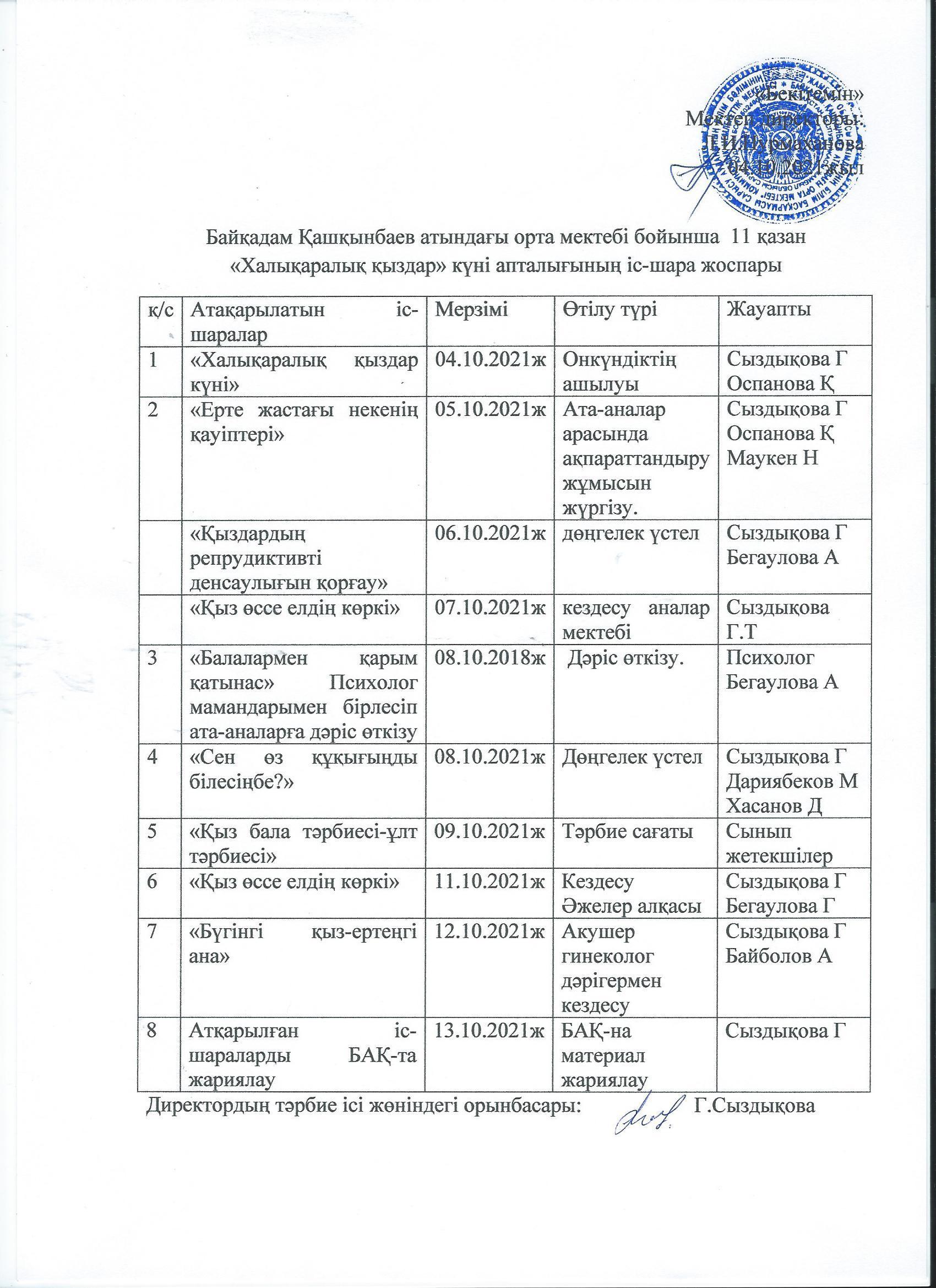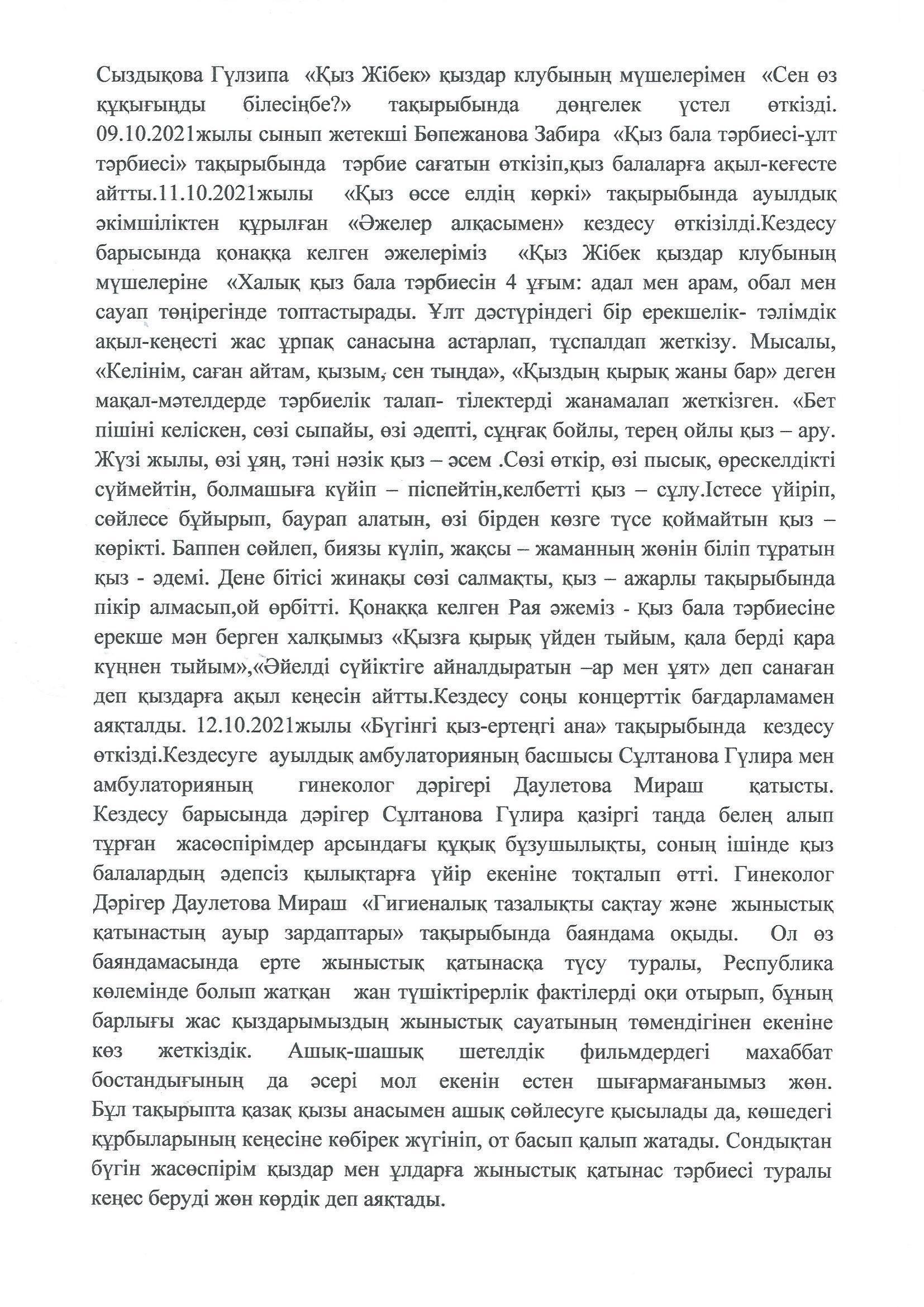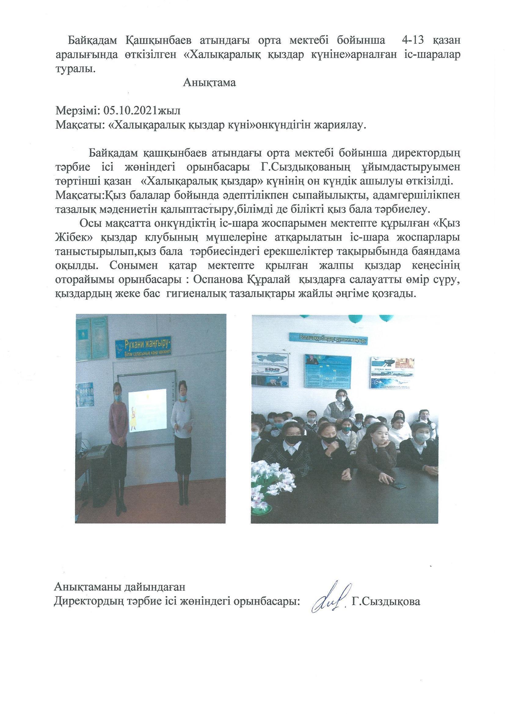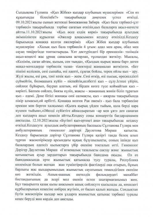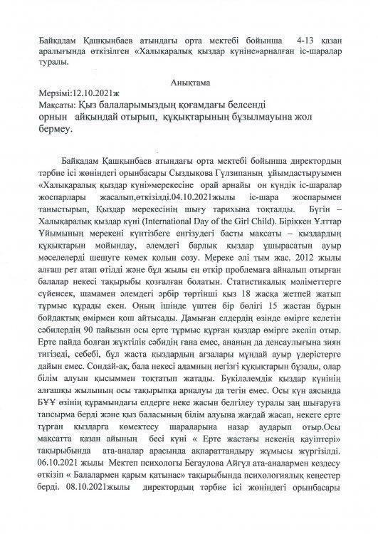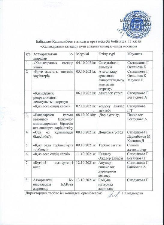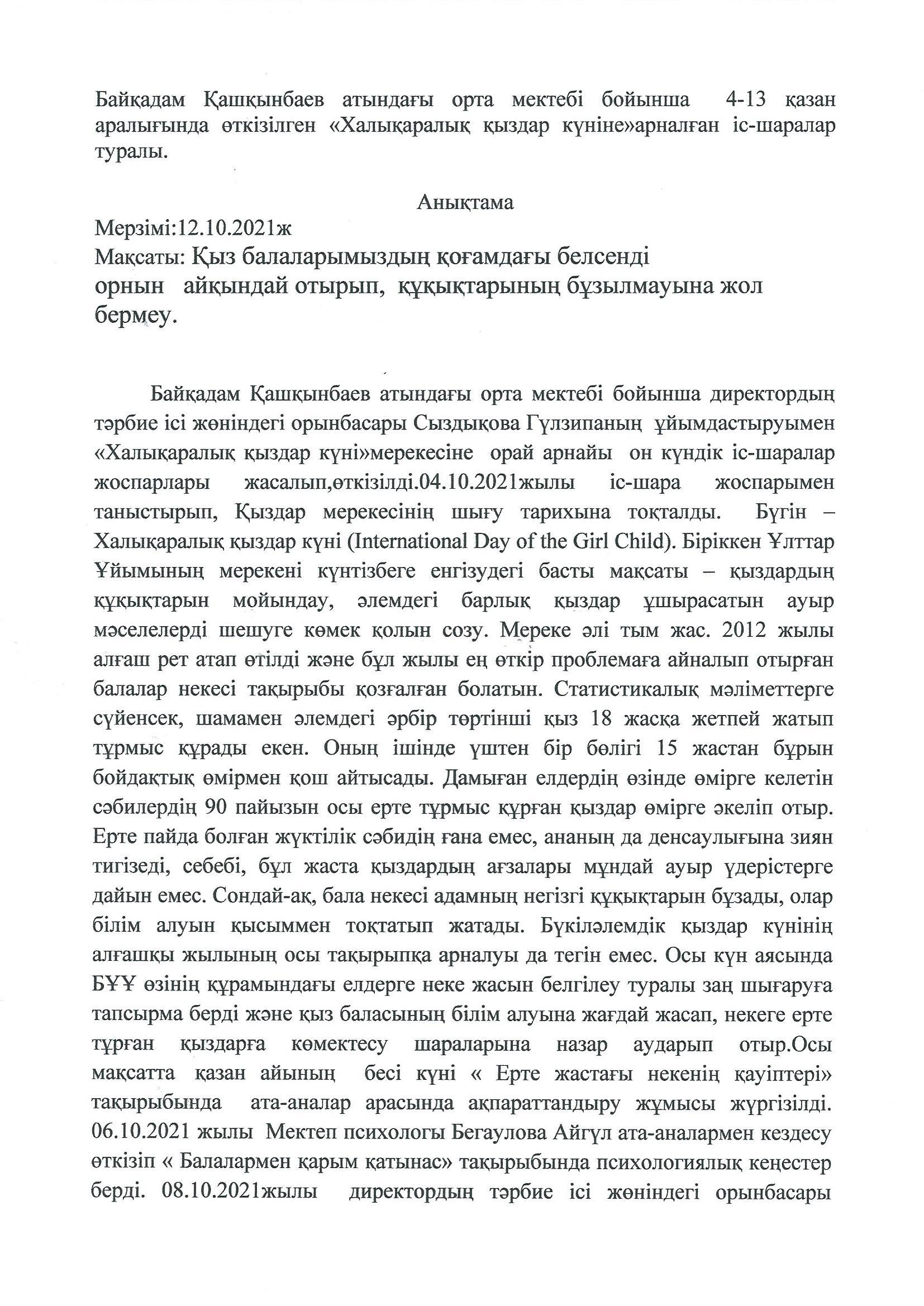 11 октябрь 2021 0 1 2 3 4 5 11 қазан - Халықаралық қыздар" күніне орай жасалған іс- шара жоспарына сәйкес жұмыстар атқарылуда.