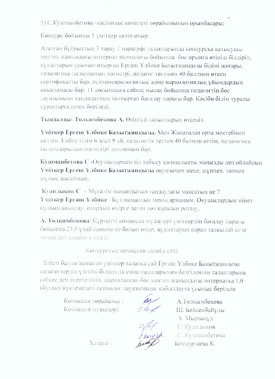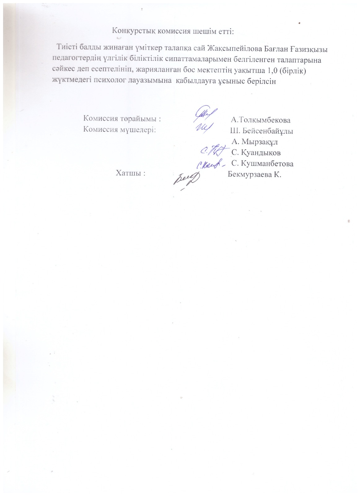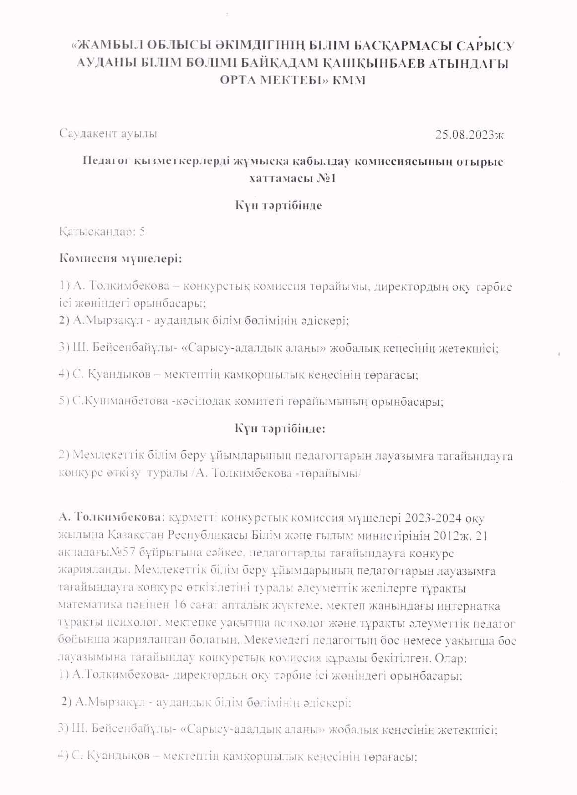 25 август 2023 0 1 2 3 4 5 Педагог лауазымына тағайындауға арналған конкурс жарияланып, конкурстық коммиссия шешімі шықты.