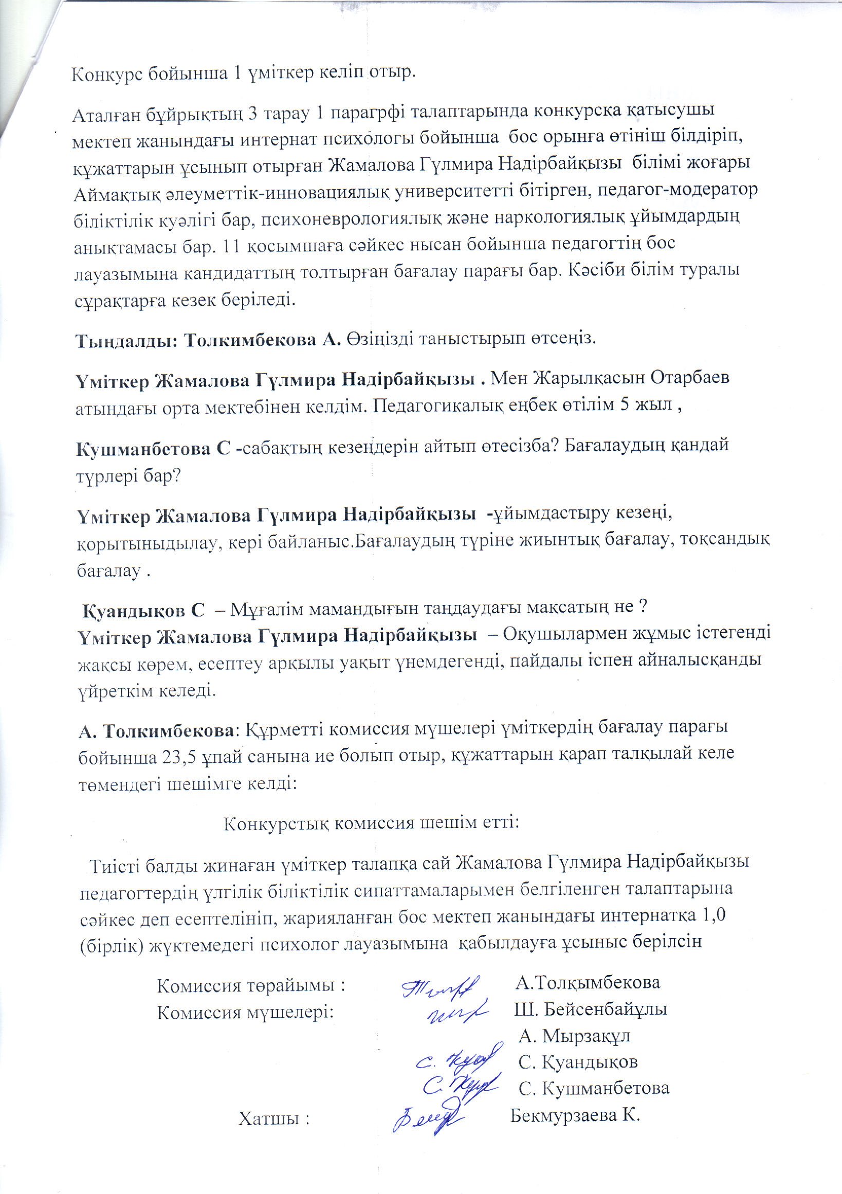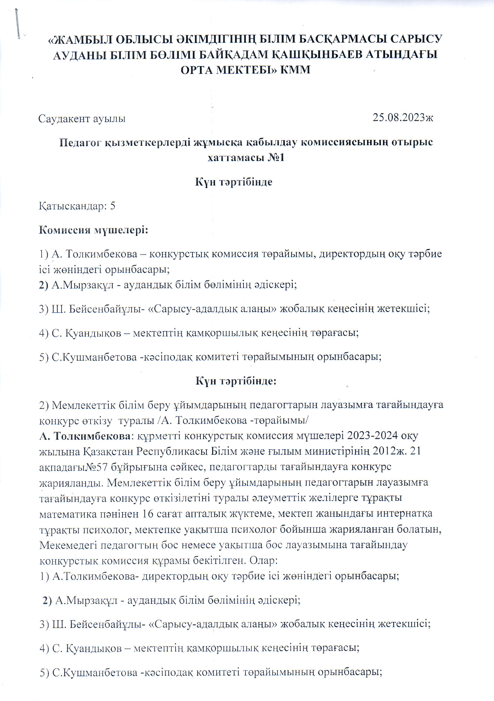 Педагог қызметкерді жұмысқа қабылдау комиссиясының шешімі » Жамбылская область Сарысуйский районс.Саудакент сш. им. Байкадама Кашкинбаева