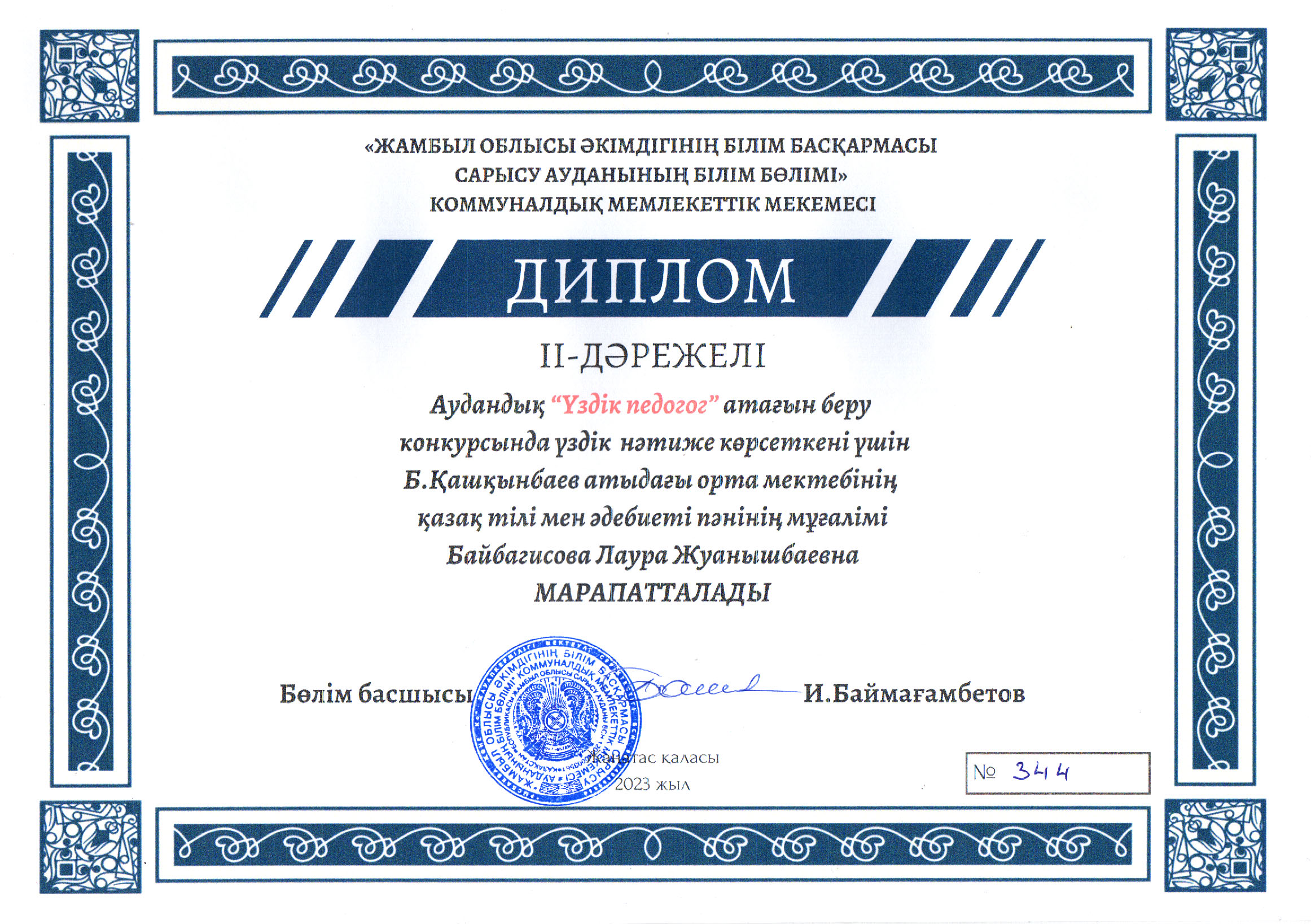 Аудандық "Үздік педагог - 2023" байқауында жүлделі ІІ орынды еншіледі. » Жамбылская область Сарысуйский районс.Саудакент сш. им. Байкадама Кашкинбаева
