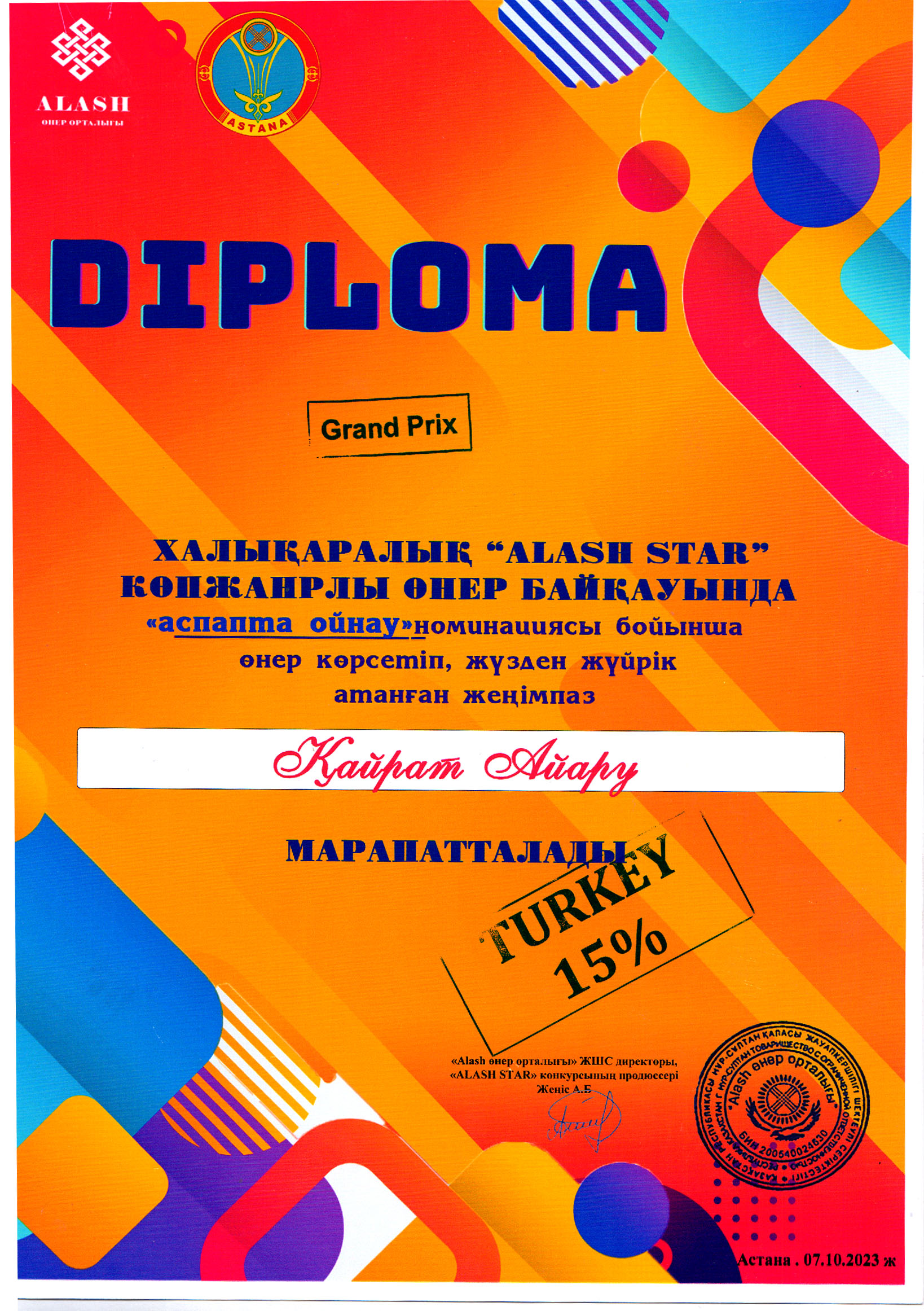 Оқушымыз халықаралық байқауда Гран При еншіледі.