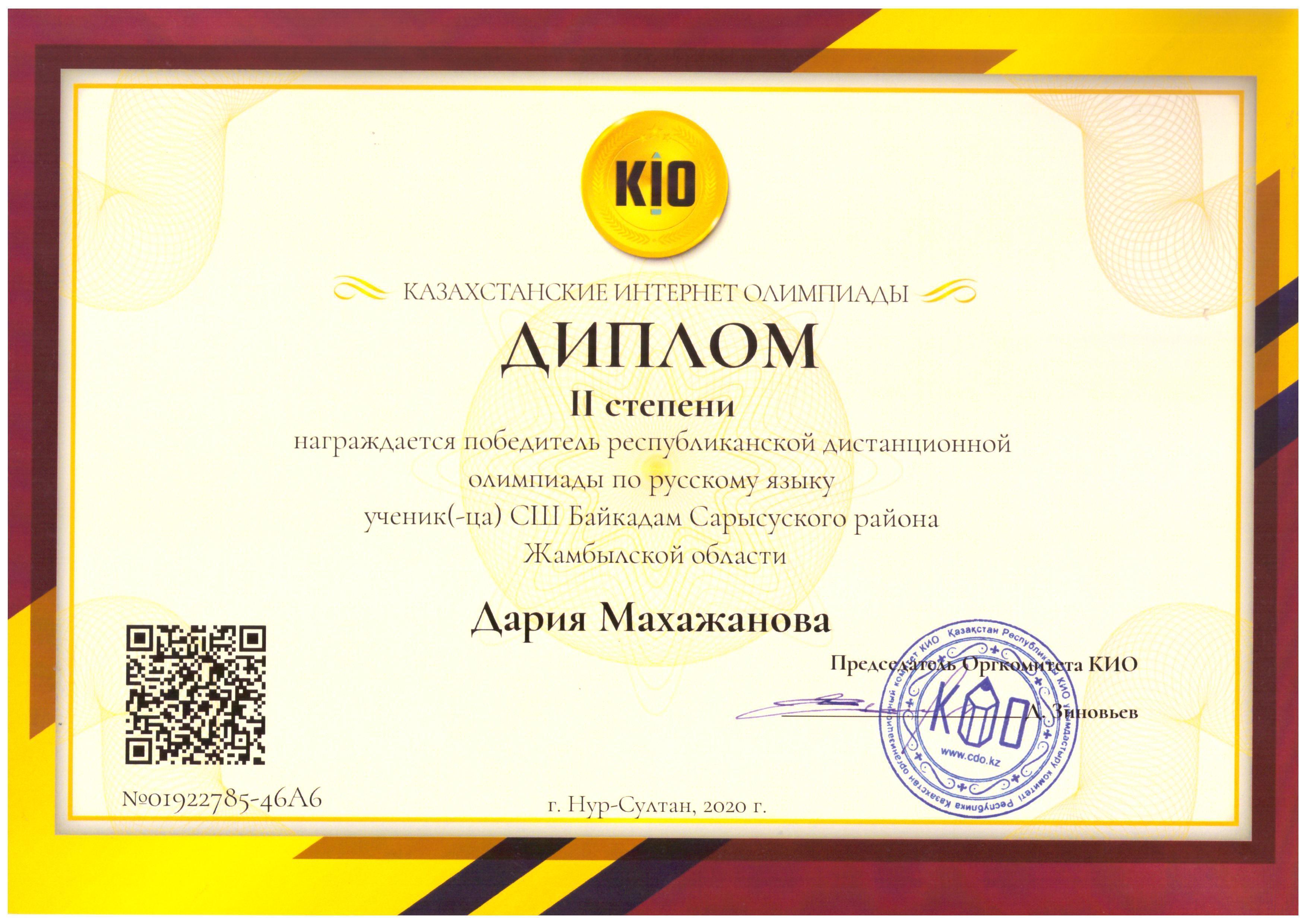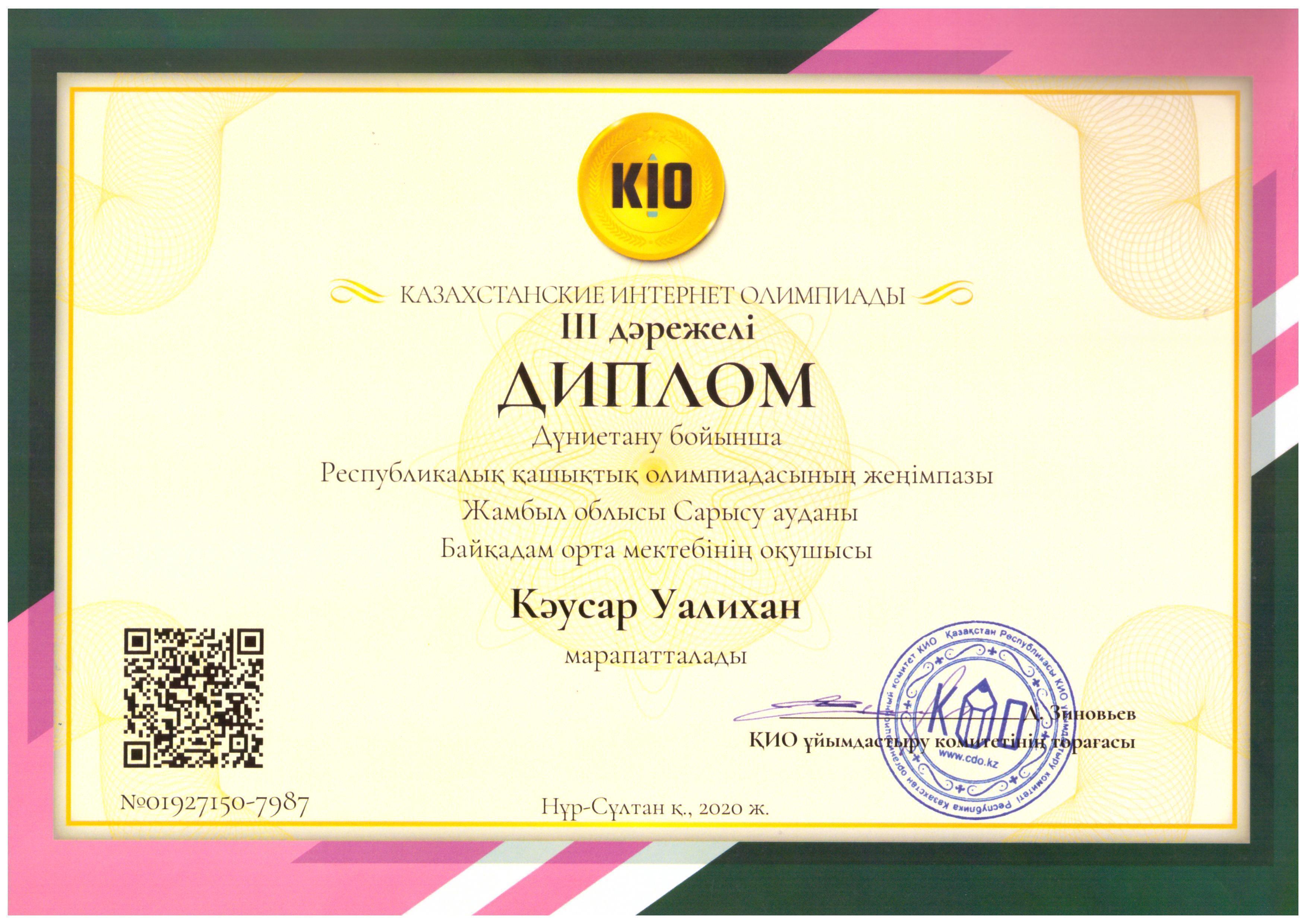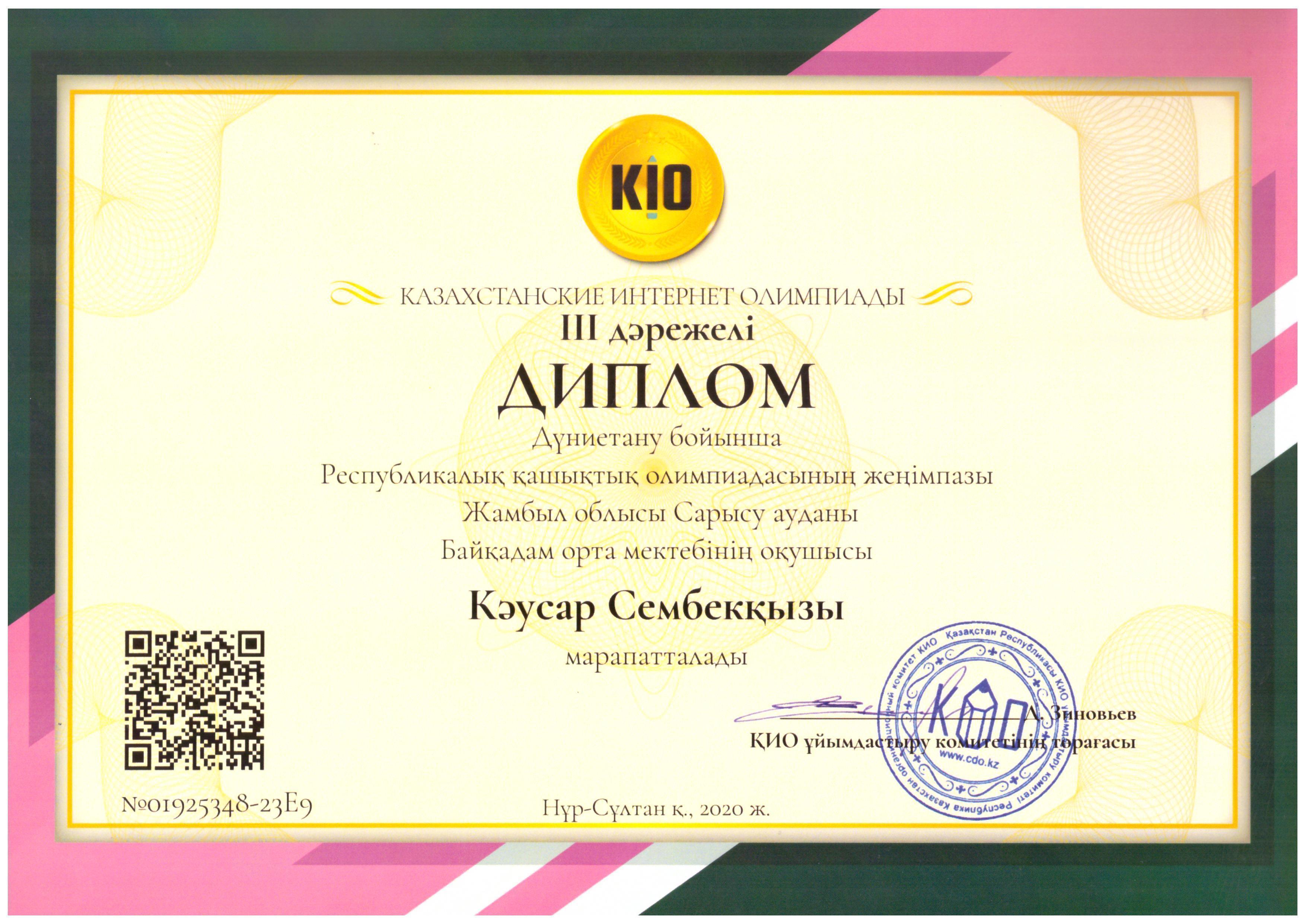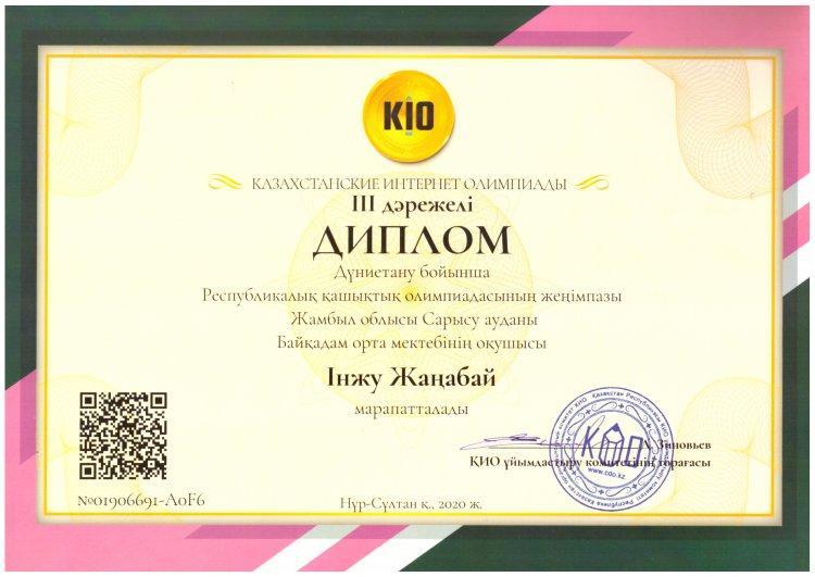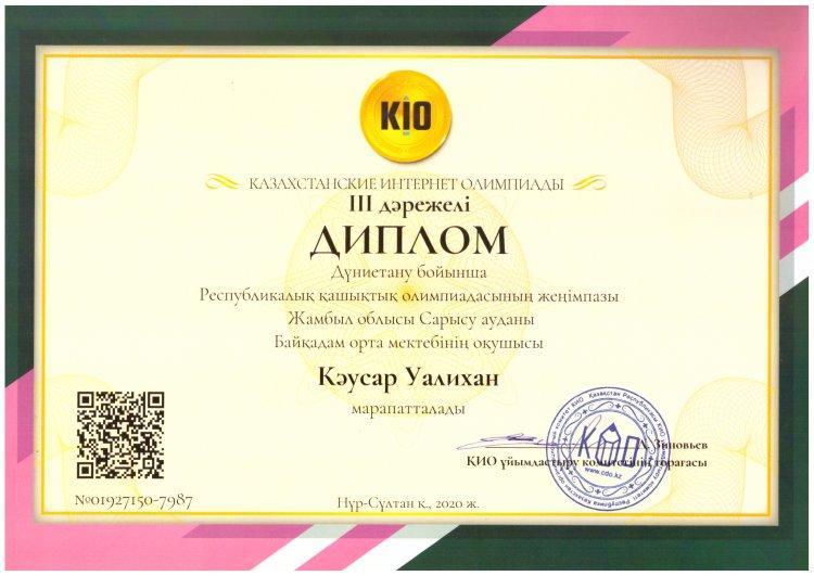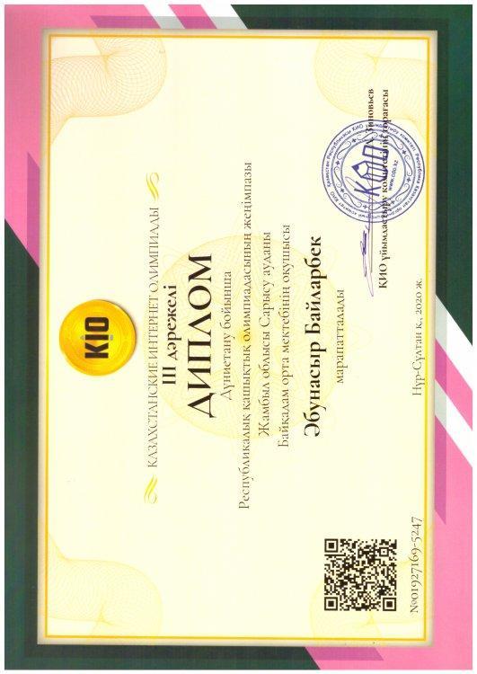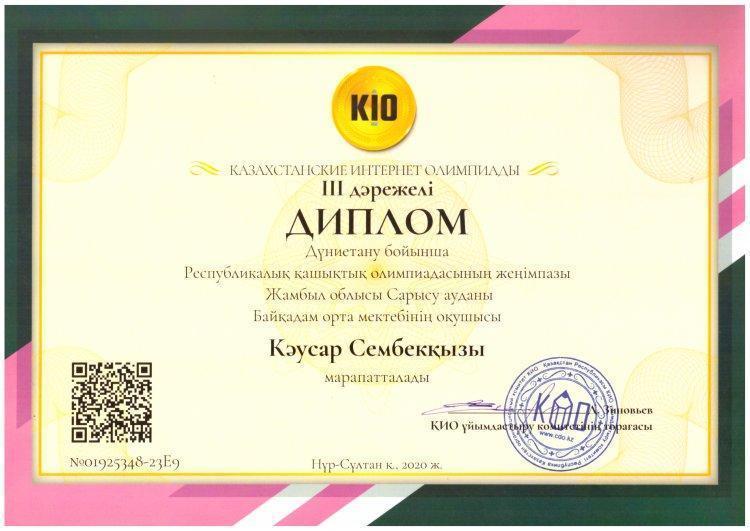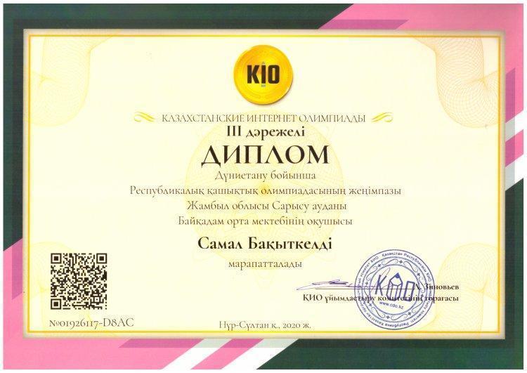 Оқушыларымыз КИО олимпиадасы жүлдегерлері атанды. » Жамбылская область Сарысуйский районс.Саудакент сш. им. Байкадама Кашкинбаева